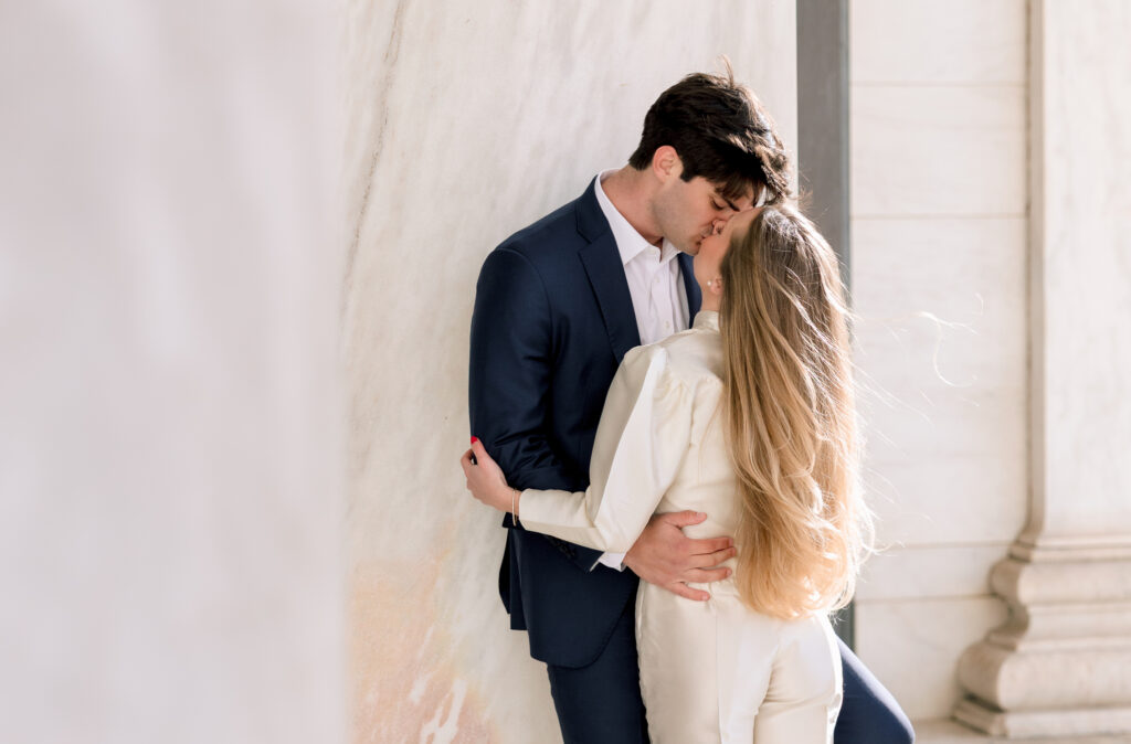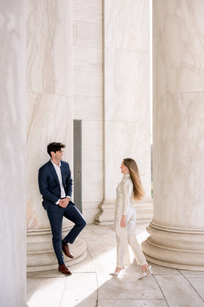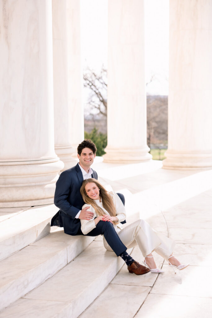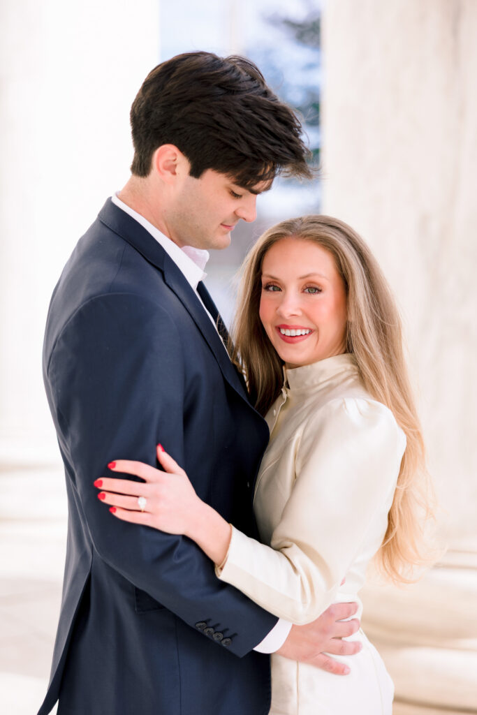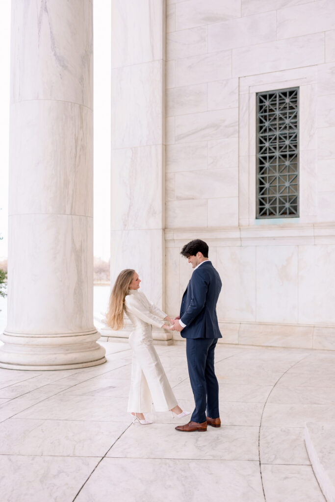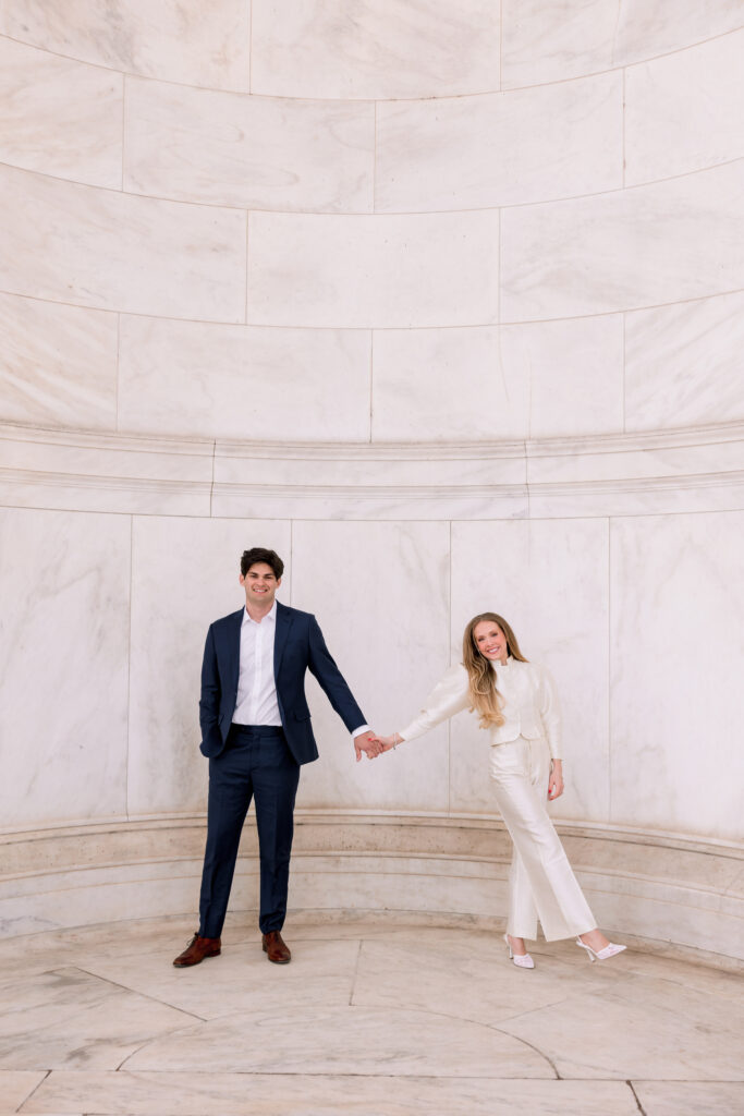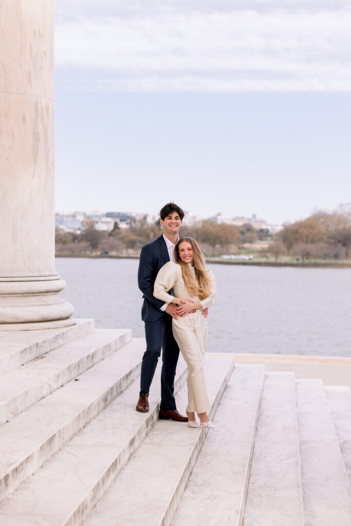 At the Jefferson Memorial, the soft stone architecture and open views created the perfect backdrop for portraits that felt classic, romantic, and full of quiet emotion. There’s a steadiness to that space, refined, peaceful, and full of ageless appeal, that paired so naturally with Abbie Grace and William’s connection. They moved through each moment with such ease, and the result was imagery that felt both elevated and organic.
