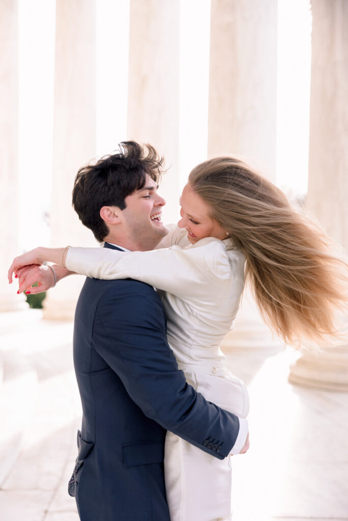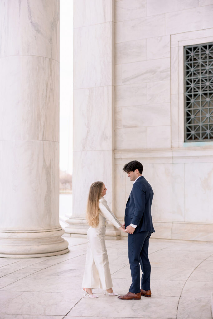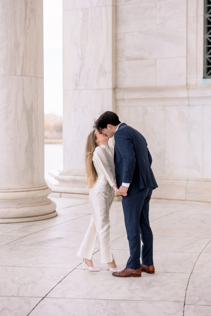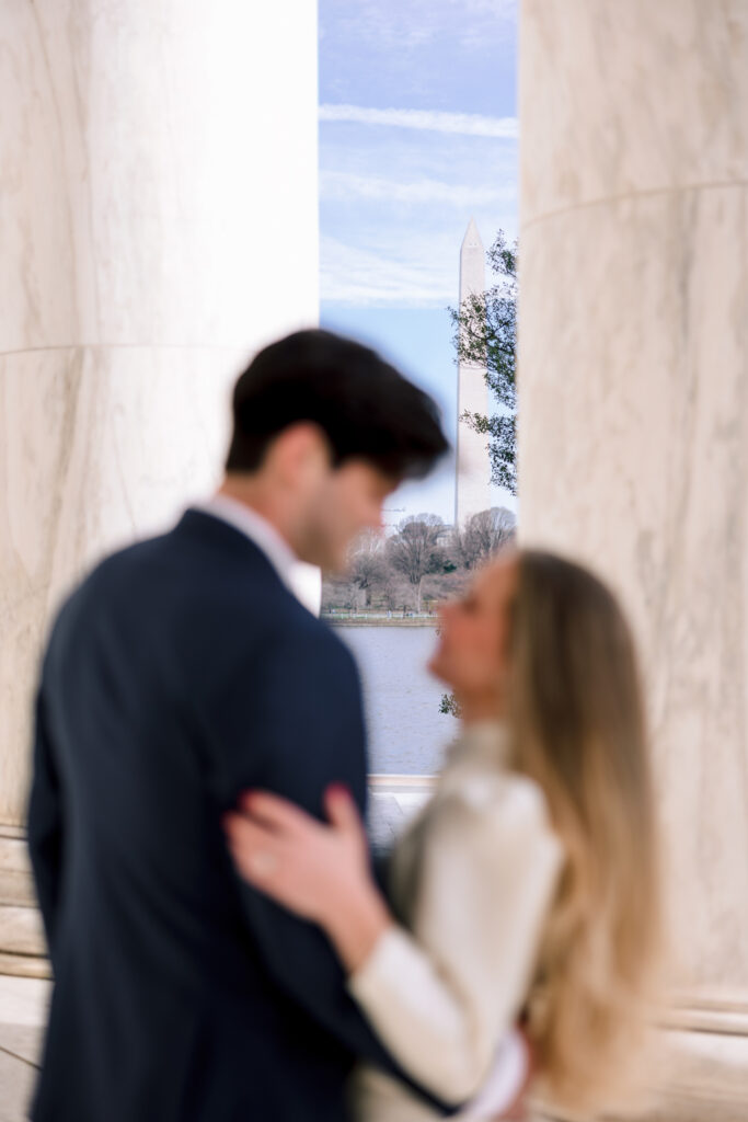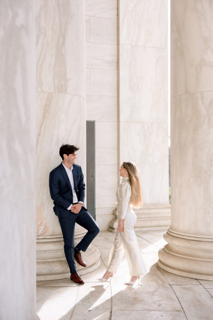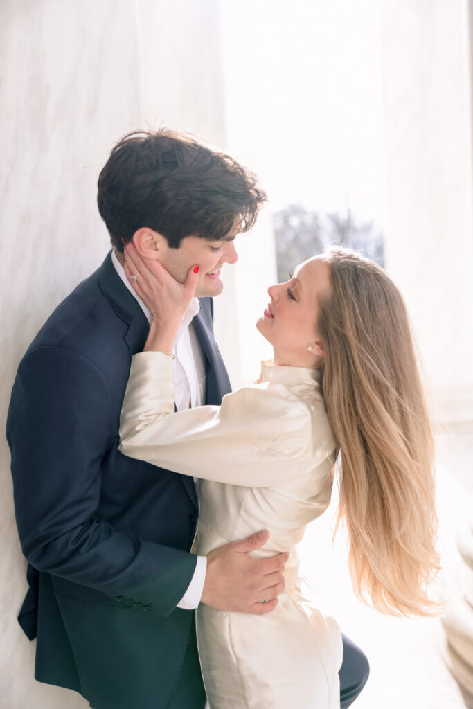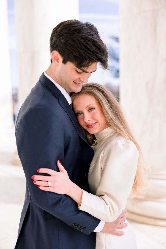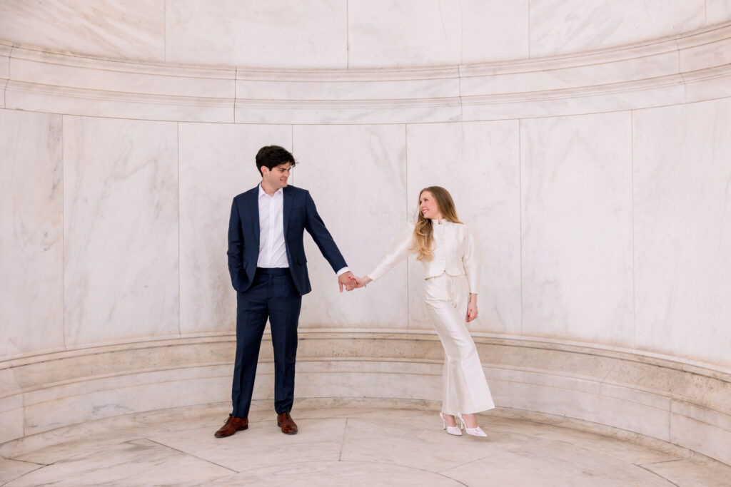 At the Jefferson Memorial, the soft stone architecture and open views created the perfect backdrop for portraits that felt classic, romantic, and full of quiet emotion. There’s a steadiness to that space, refined, peaceful, and full of ageless appeal, that paired so naturally with Abbie Grace and William’s connection. They moved through each moment with such ease, and the result was imagery that felt both elevated and organic.