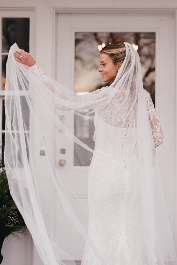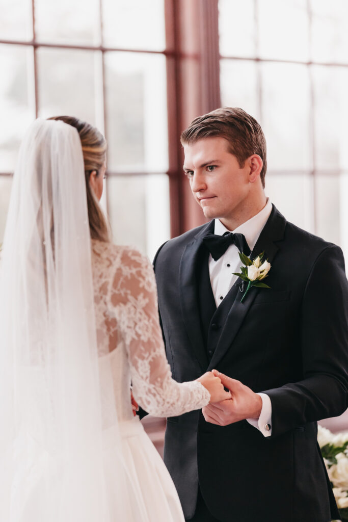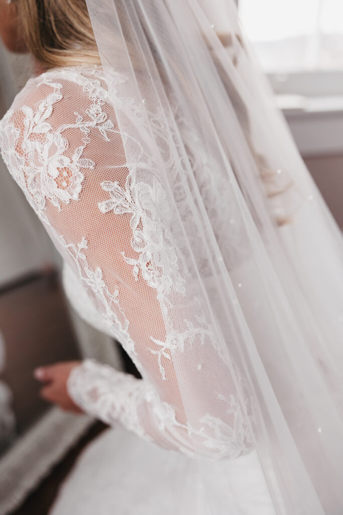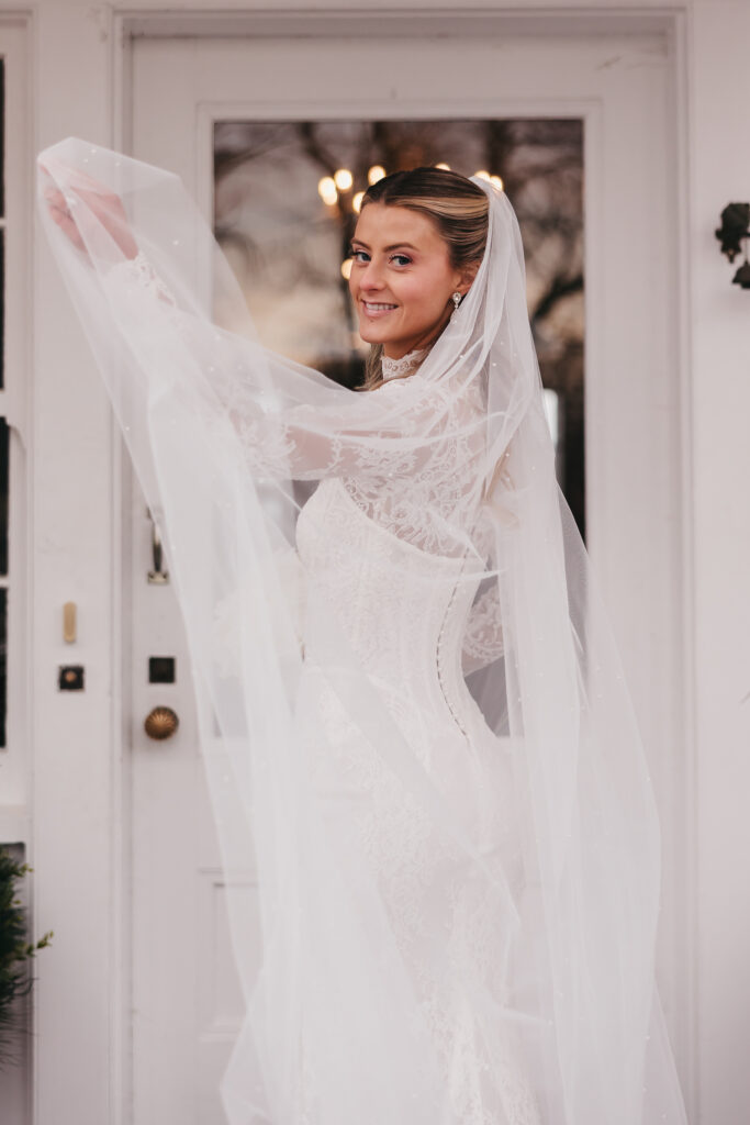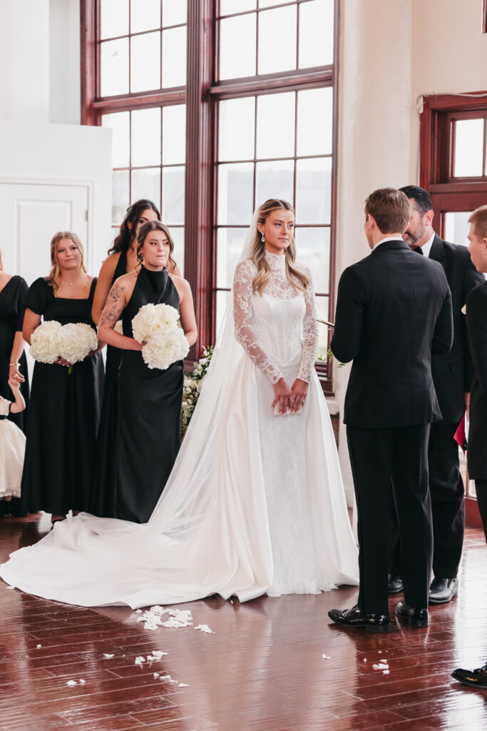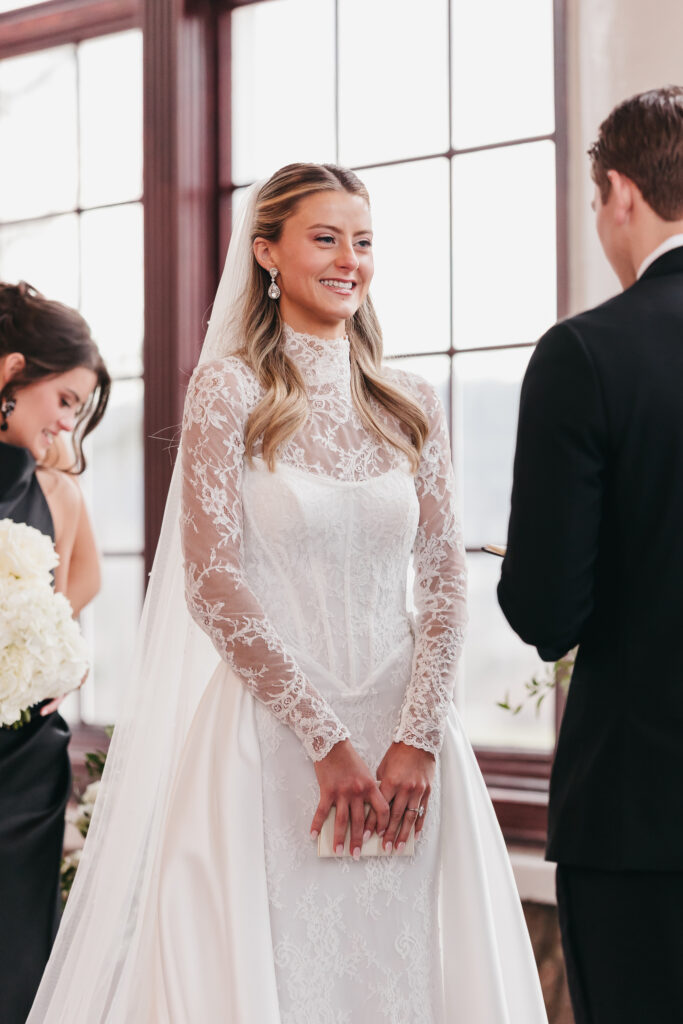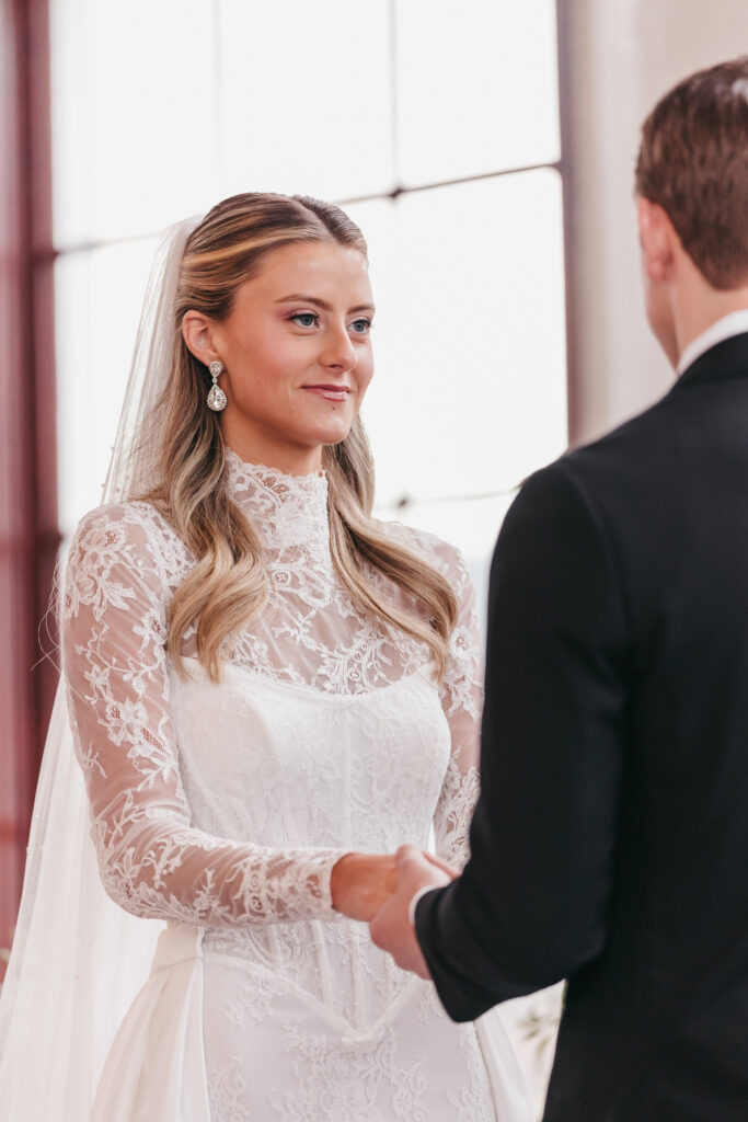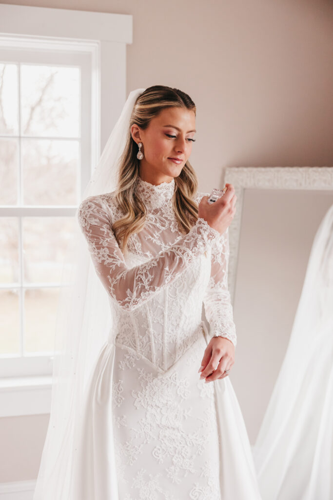 The air carried a gentle December chill as the morning unfolded, crisp, still, and full of anticipation. Inside the bridal suite, warm light filtered through tall windows, catching on lace fabric, gold and silver details, and the soft movement of hands helping Olivia into her gown. There was an unspoken reverence and so much joy in the room — the kind that settles when something meaningful is about to begin. It was such a fun space to photograph the details and candid moments.