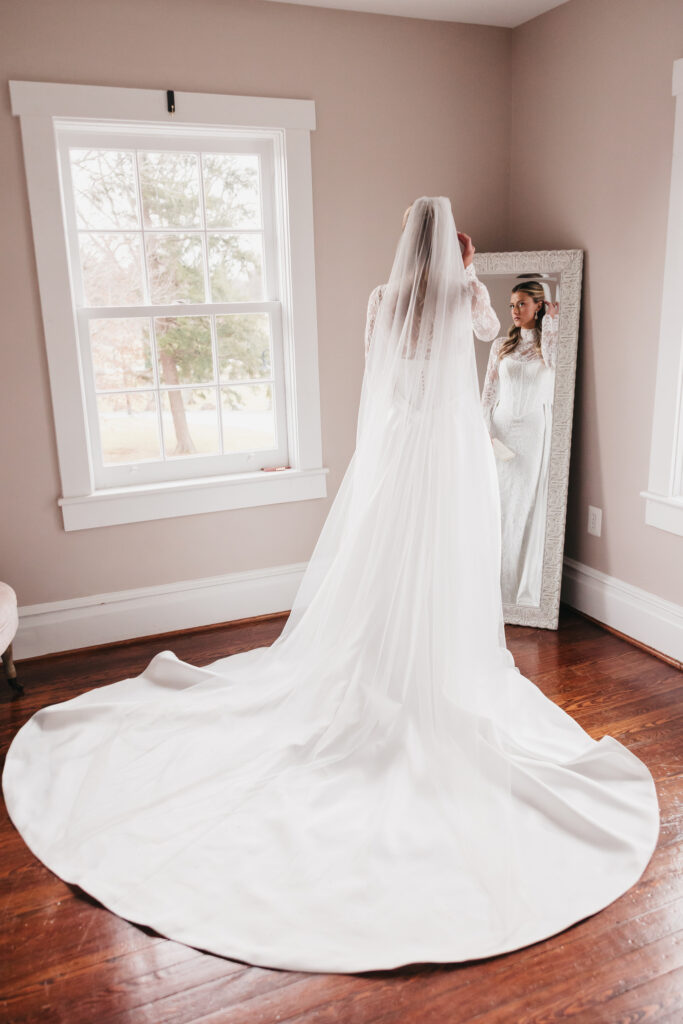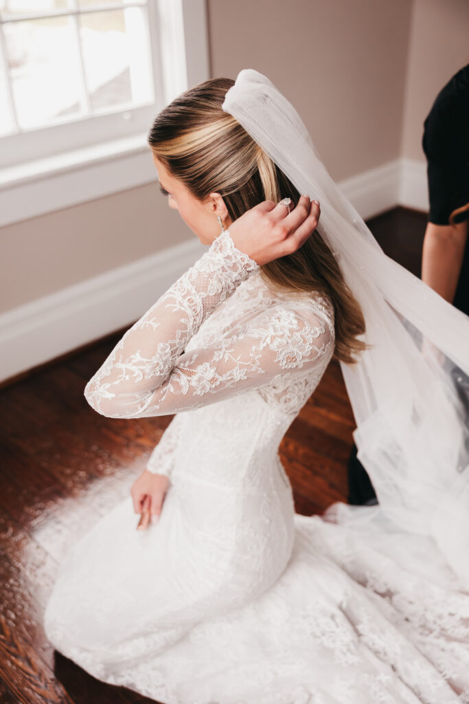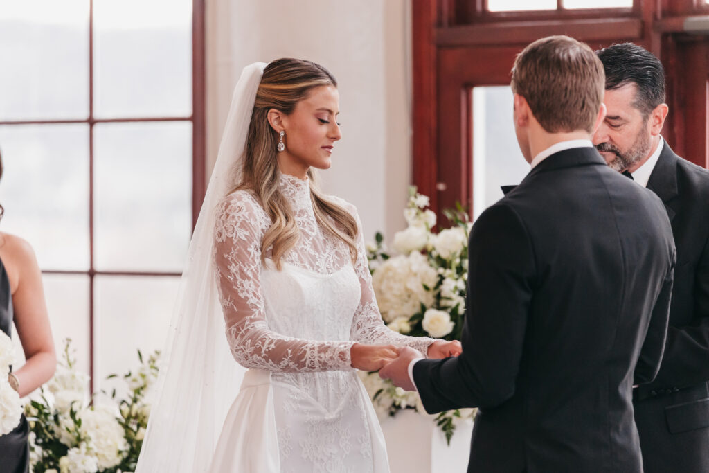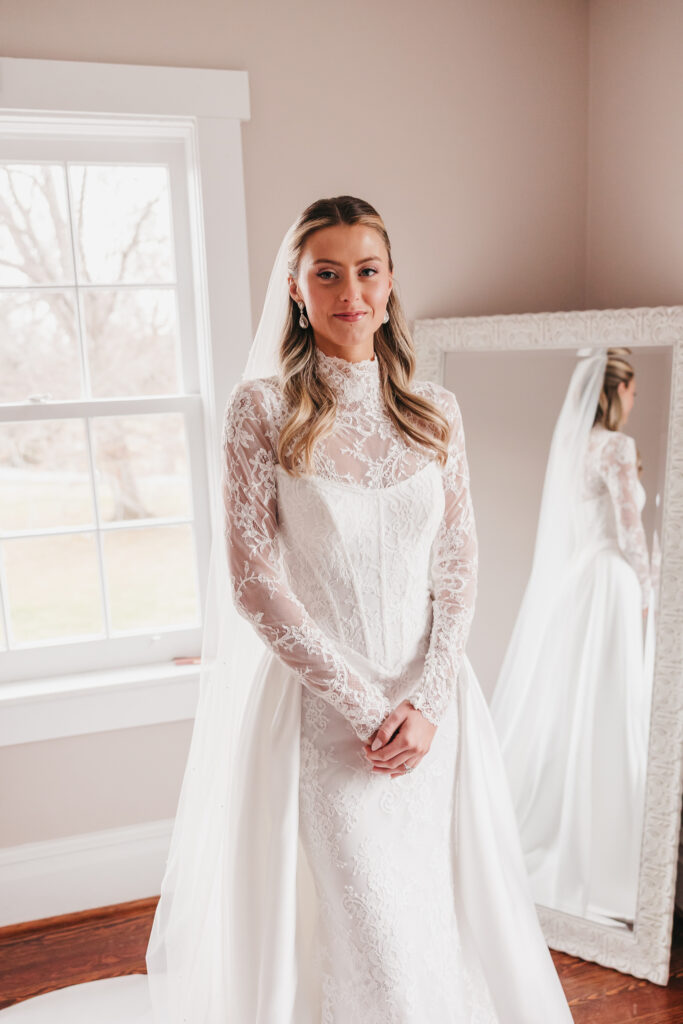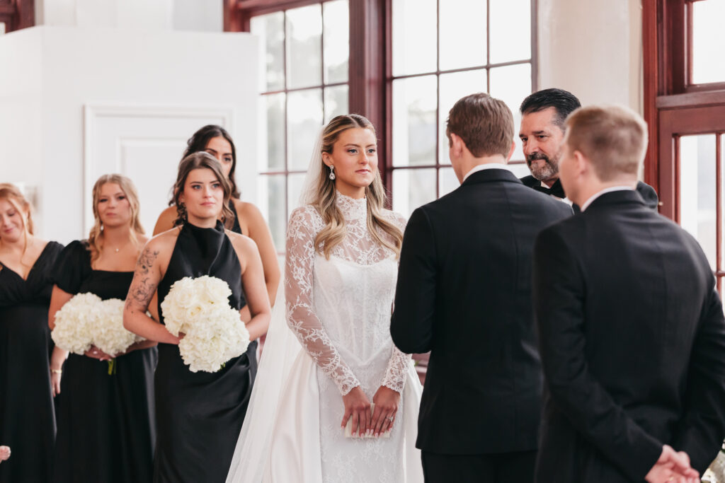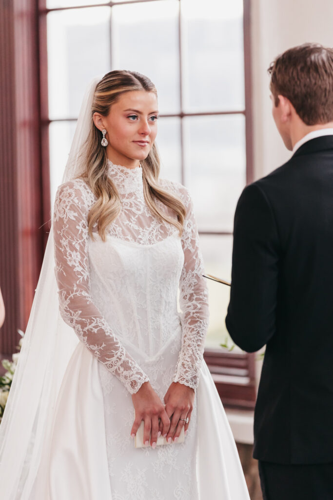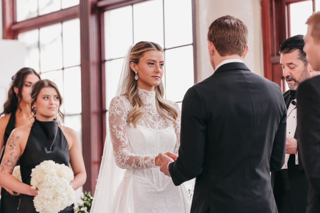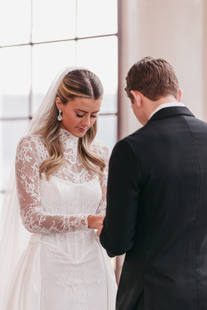 The air carried a gentle December chill as the morning unfolded, crisp, still, and full of anticipation. Inside the bridal suite, warm light filtered through tall windows, catching on lace fabric, gold and silver details, and the soft movement of hands helping Olivia into her gown. There was an unspoken reverence and so much joy in the room — the kind that settles when something meaningful is about to begin. It was such a fun space to photograph the details and candid moments.