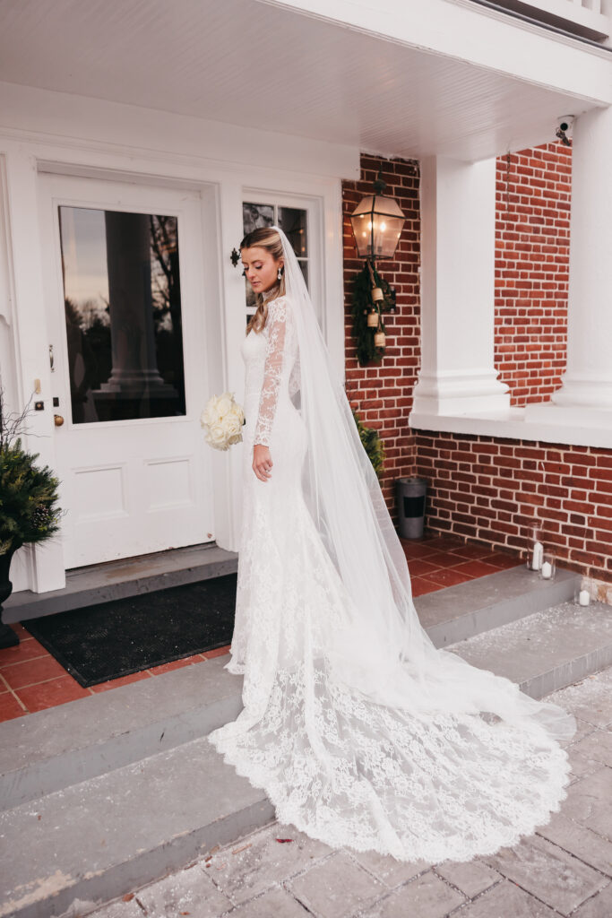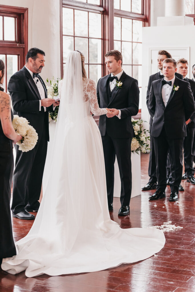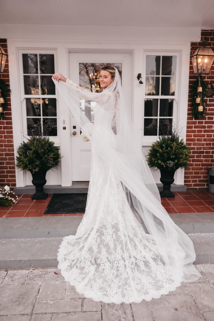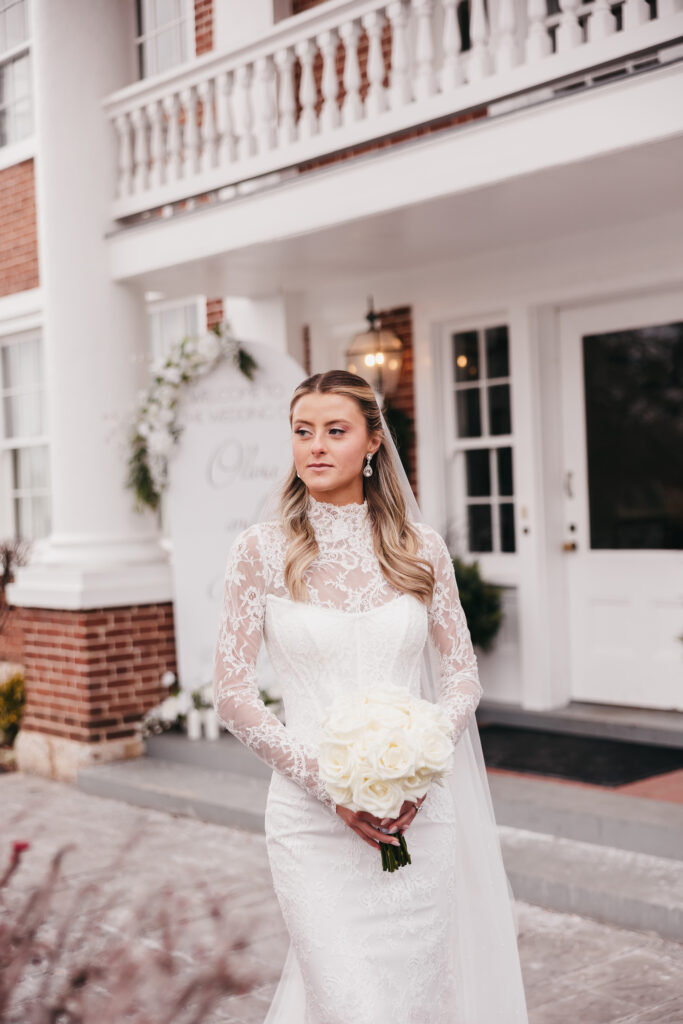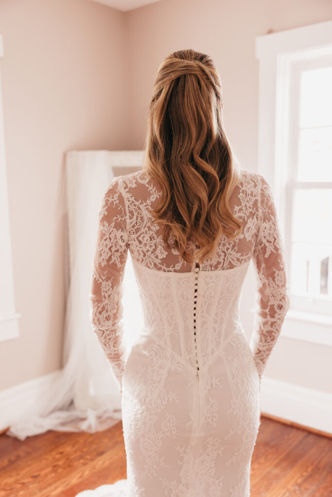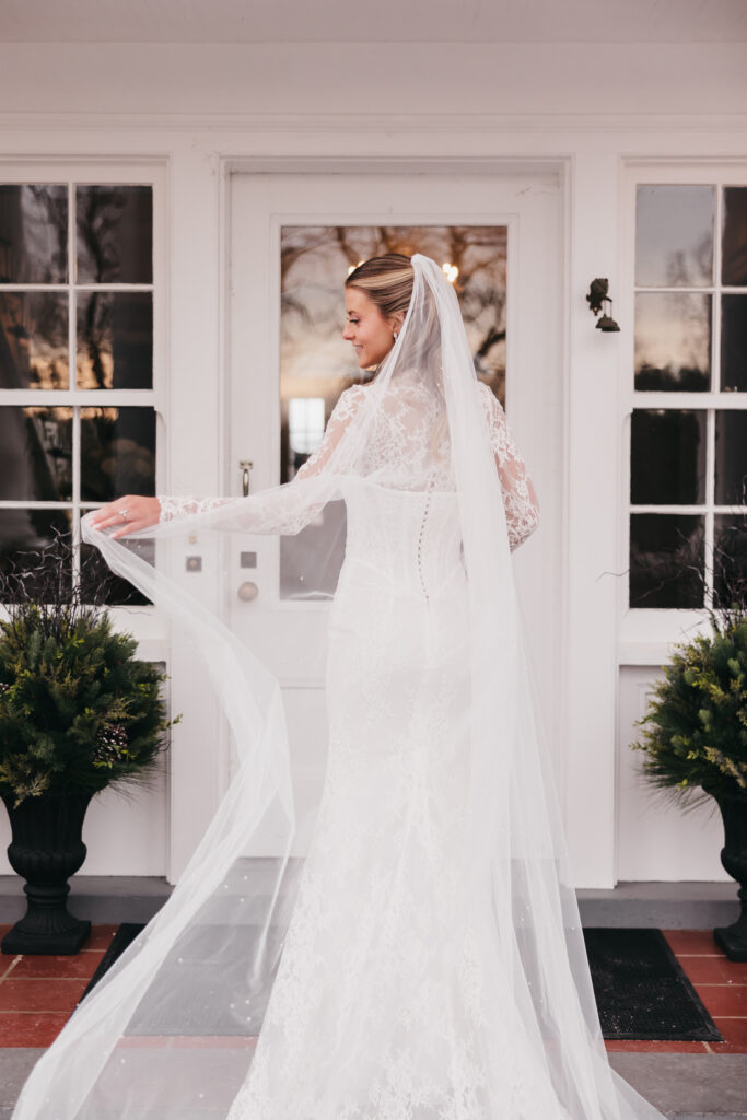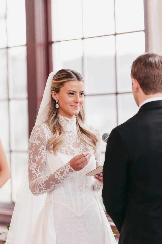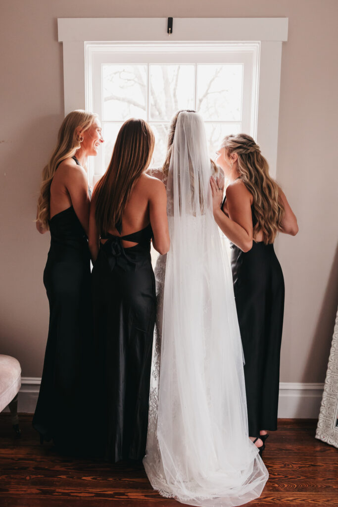 The air carried a gentle December chill as the morning unfolded, crisp, still, and full of anticipation. Inside the bridal suite, warm light filtered through tall windows, catching on lace fabric, gold and silver details, and the soft movement of hands helping Olivia into her gown. There was an unspoken reverence and so much joy in the room — the kind that settles when something meaningful is about to begin. It was such a fun space to photograph the details and candid moments.