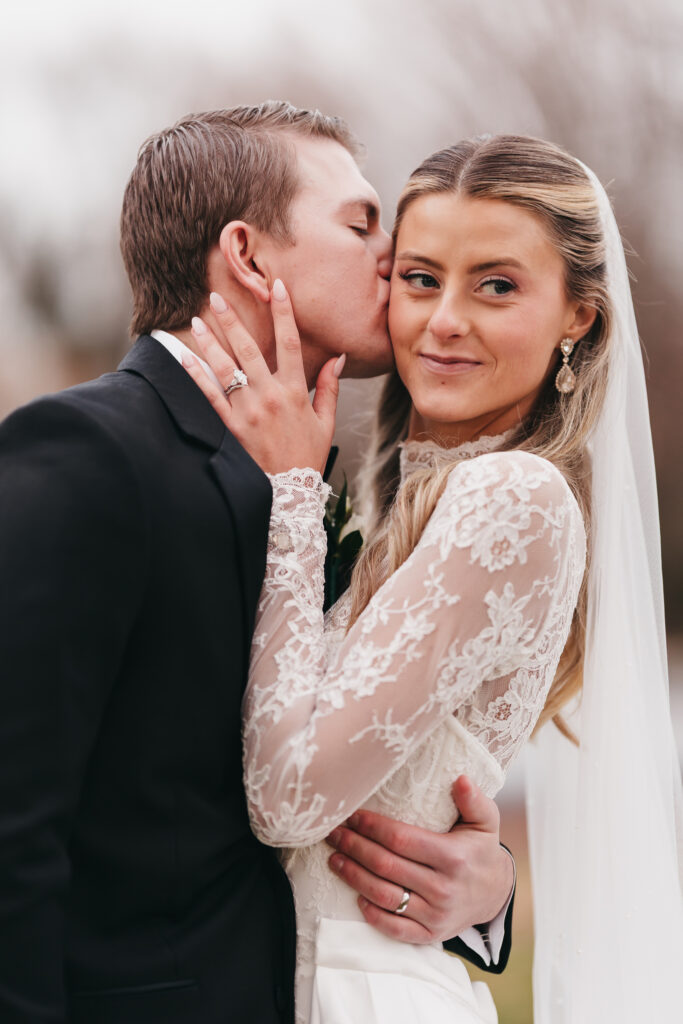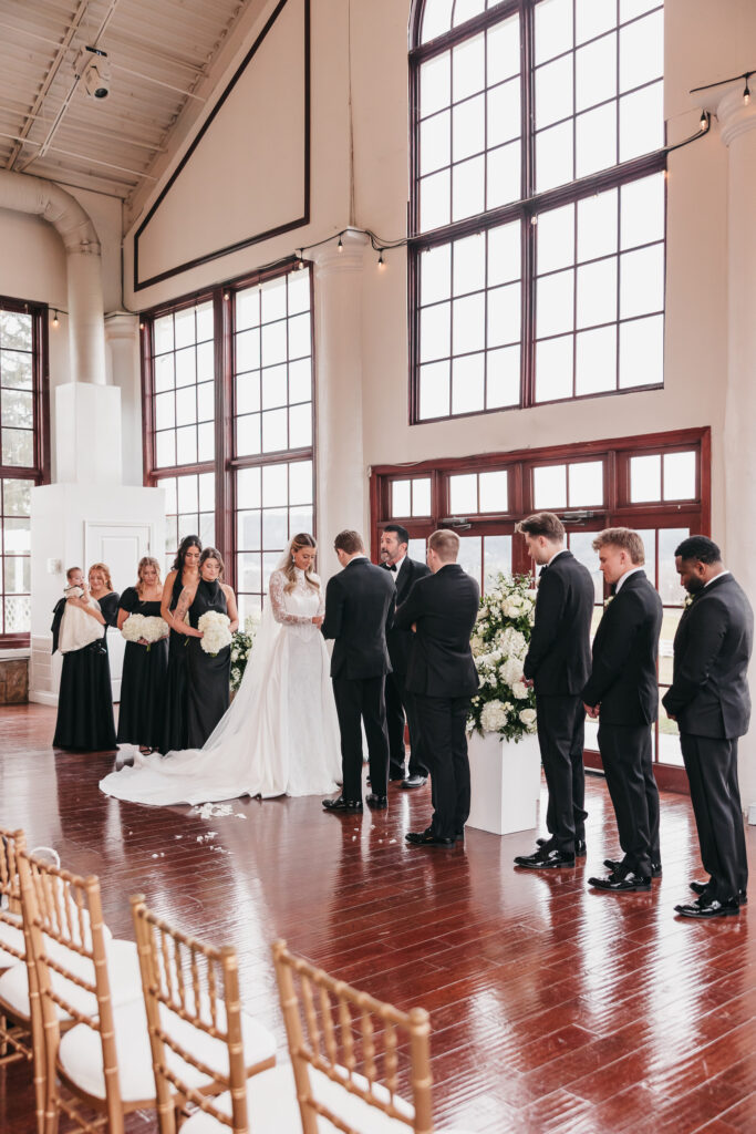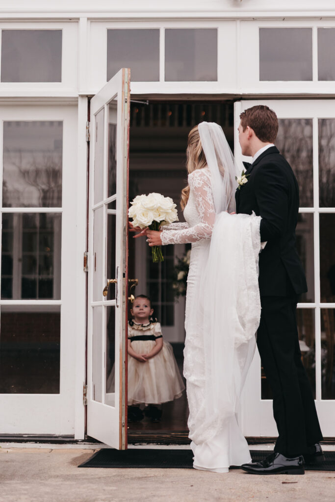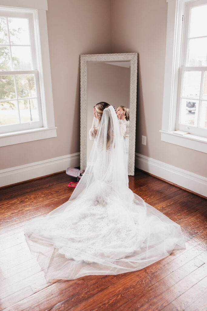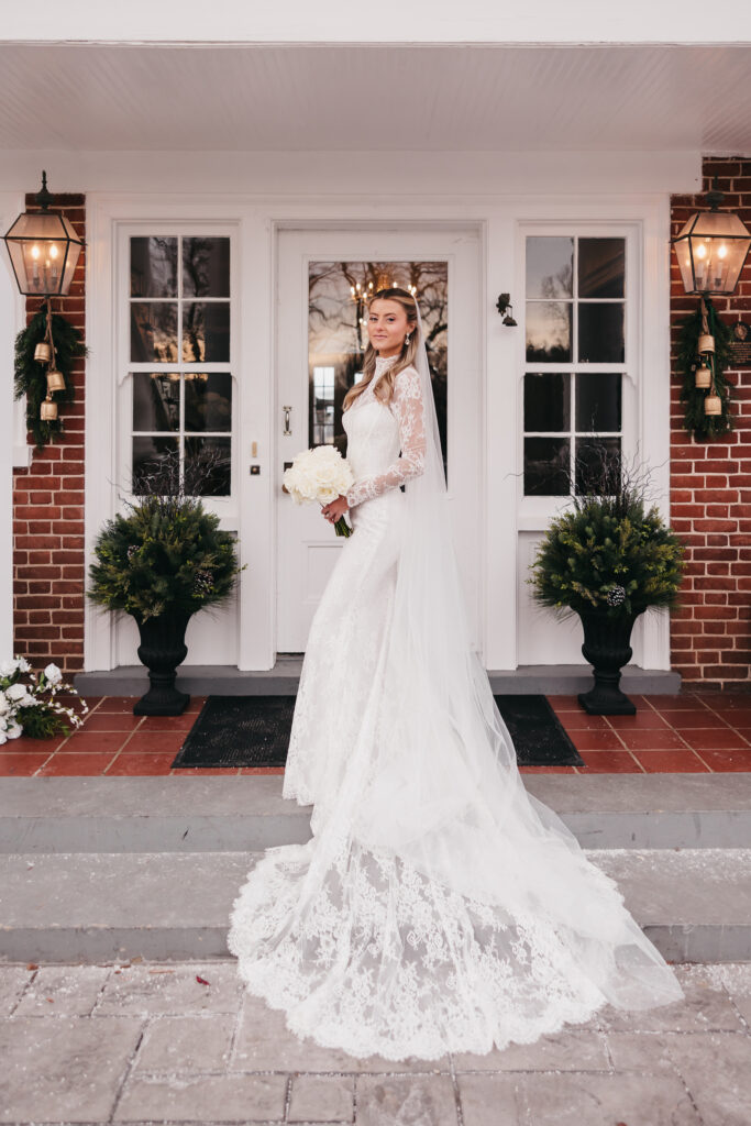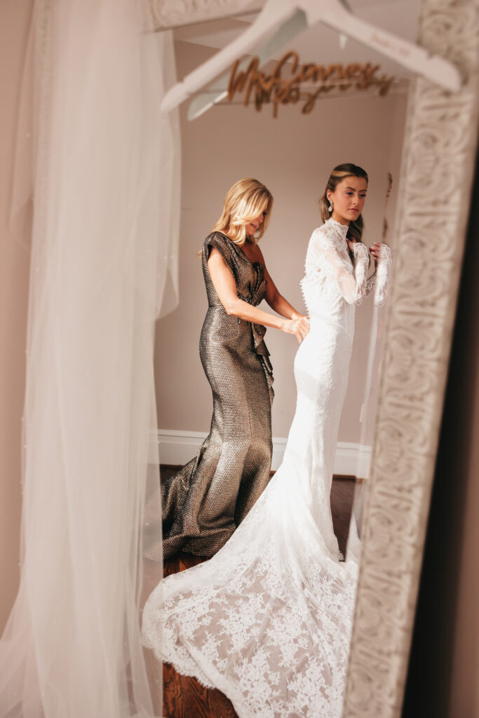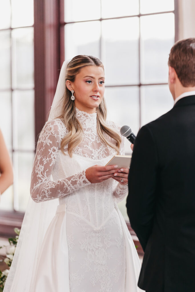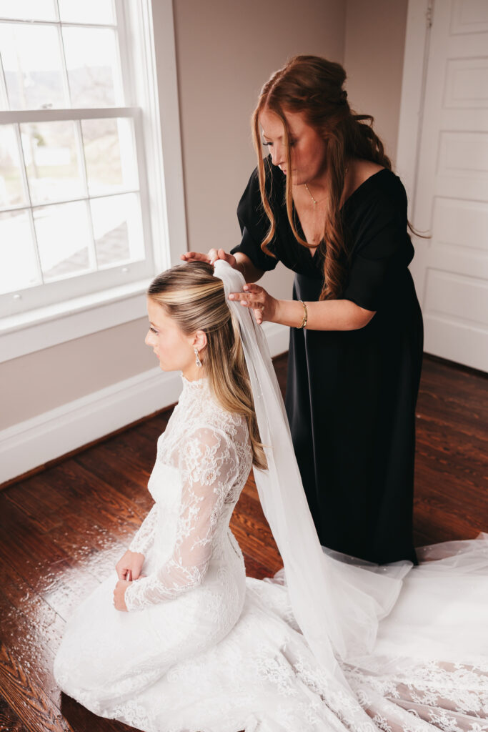 The air carried a gentle December chill as the morning unfolded, crisp, still, and full of anticipation. Inside the bridal suite, warm light filtered through tall windows, catching on lace fabric, gold and silver details, and the soft movement of hands helping Olivia into her gown. There was an unspoken reverence and so much joy in the room — the kind that settles when something meaningful is about to begin. It was such a fun space to photograph the details and candid moments.