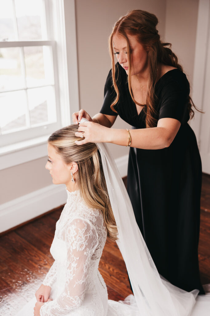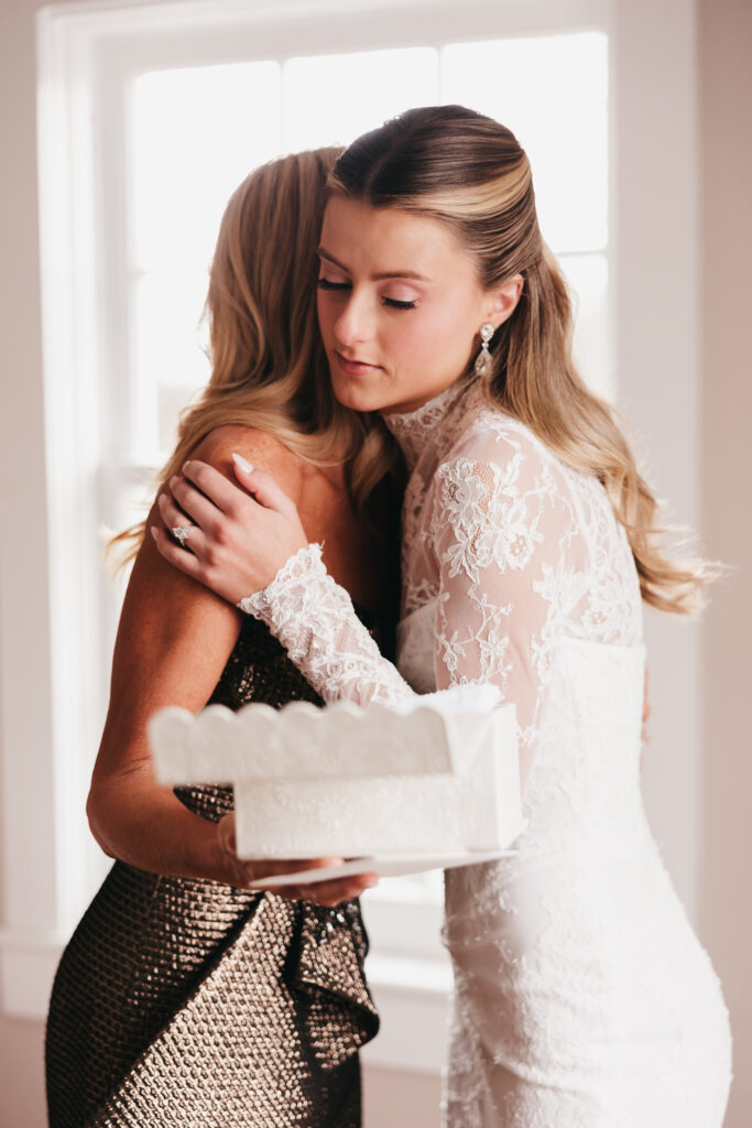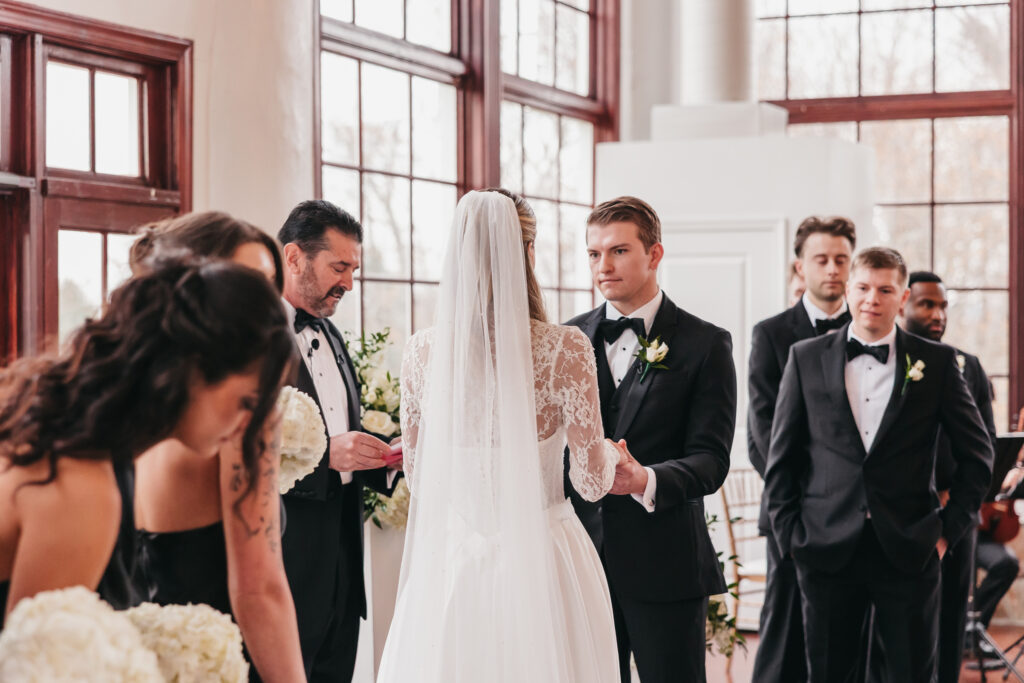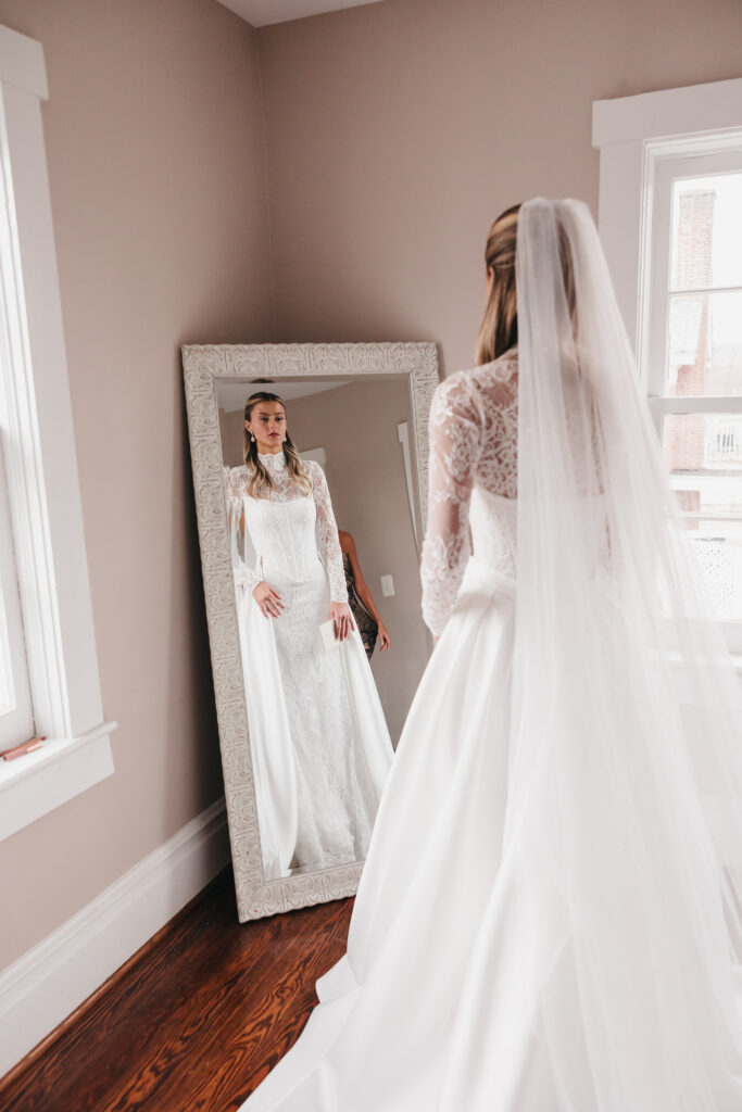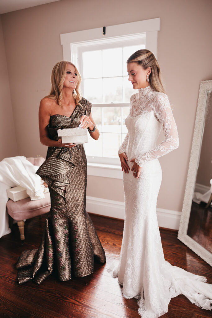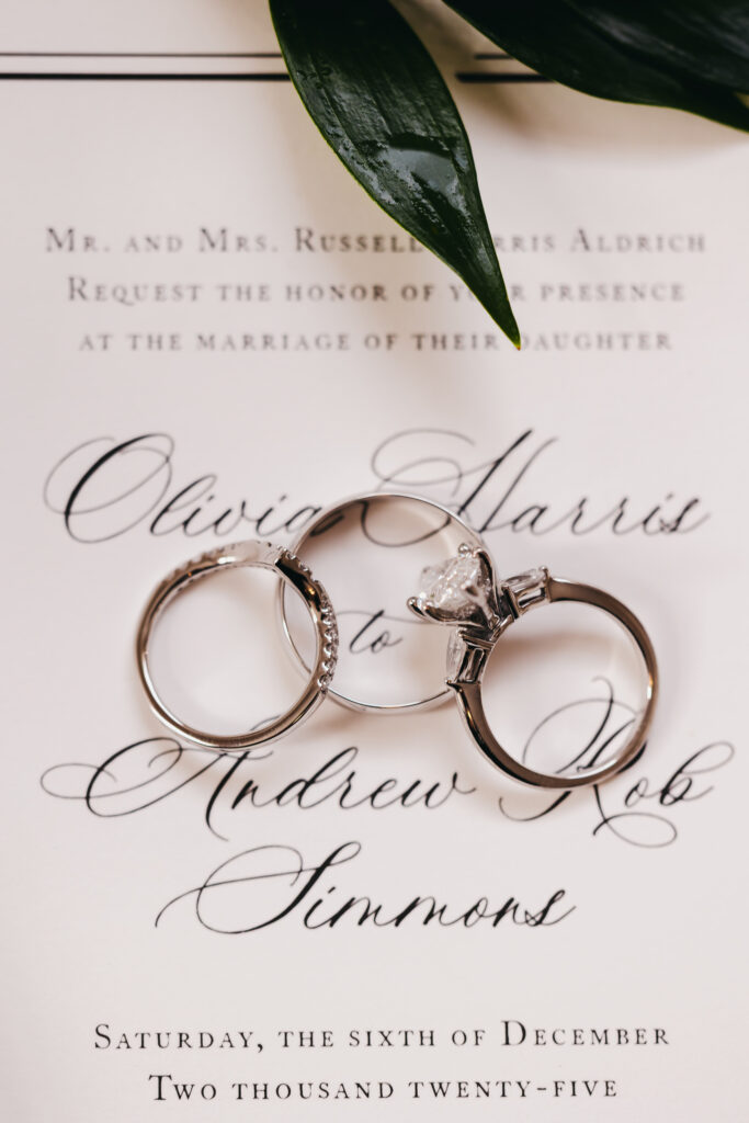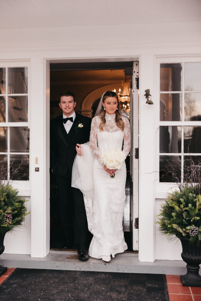 The air carried a gentle December chill as the morning unfolded, crisp, still, and full of anticipation. Inside the bridal suite, warm light filtered through tall windows, catching on lace fabric, gold and silver details, and the soft movement of hands helping Olivia into her gown. There was an unspoken reverence and so much joy in the room — the kind that settles when something meaningful is about to begin. It was such a fun space to photograph the details and candid moments.