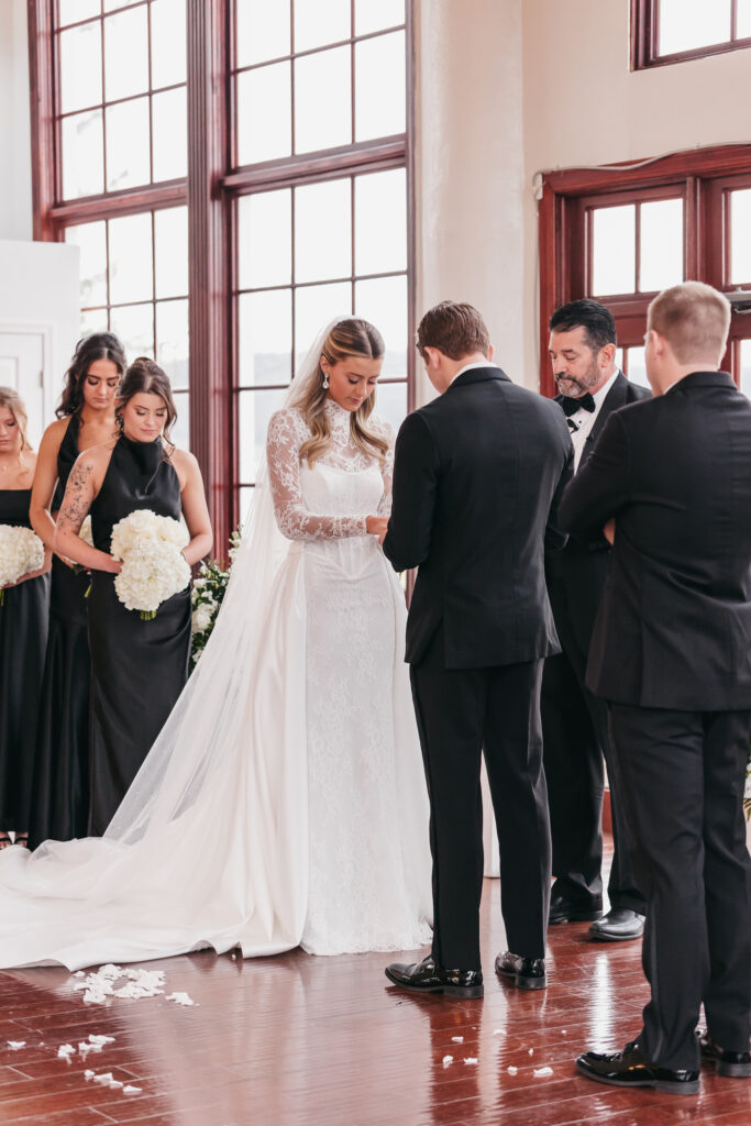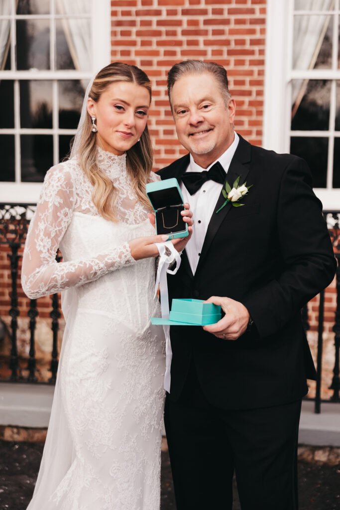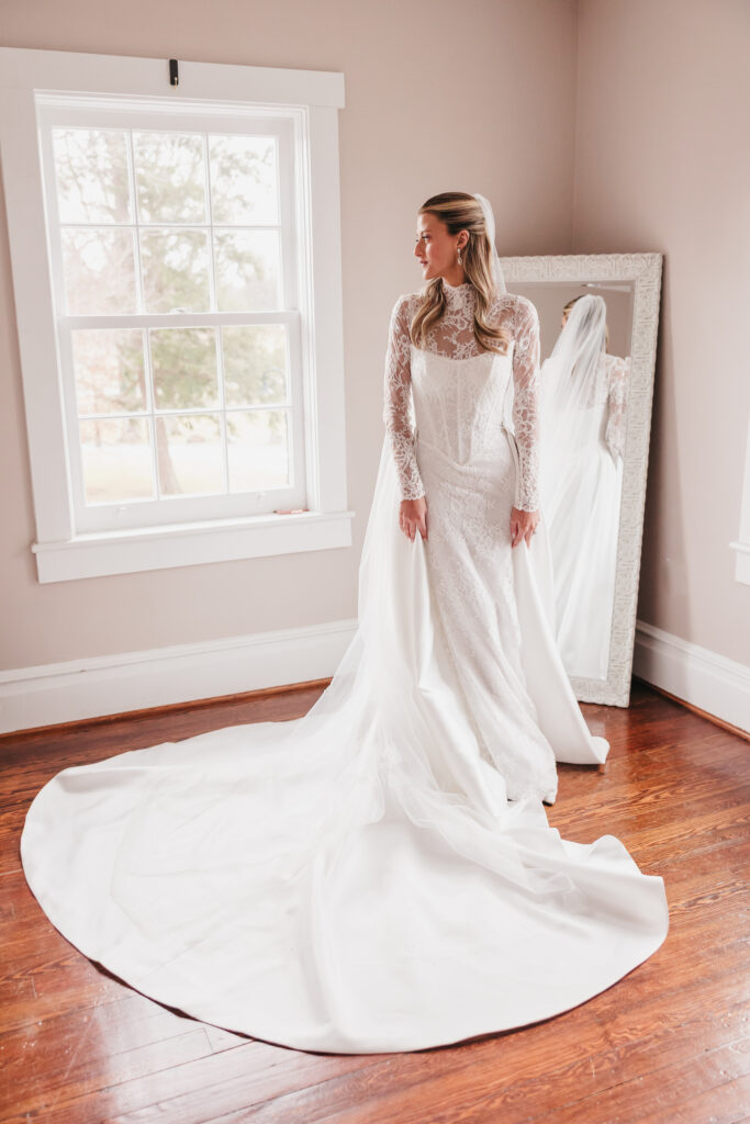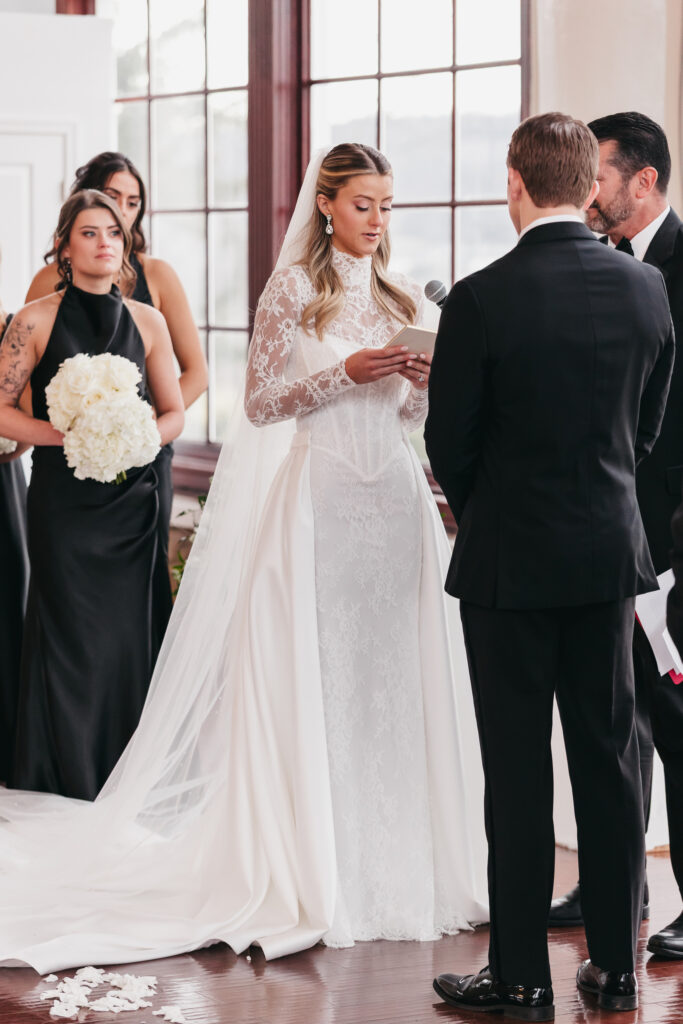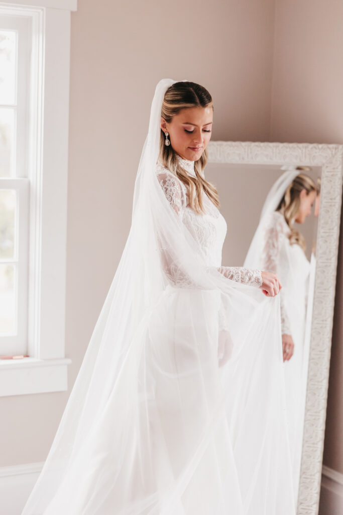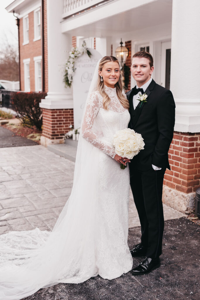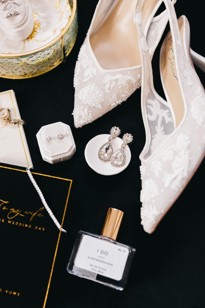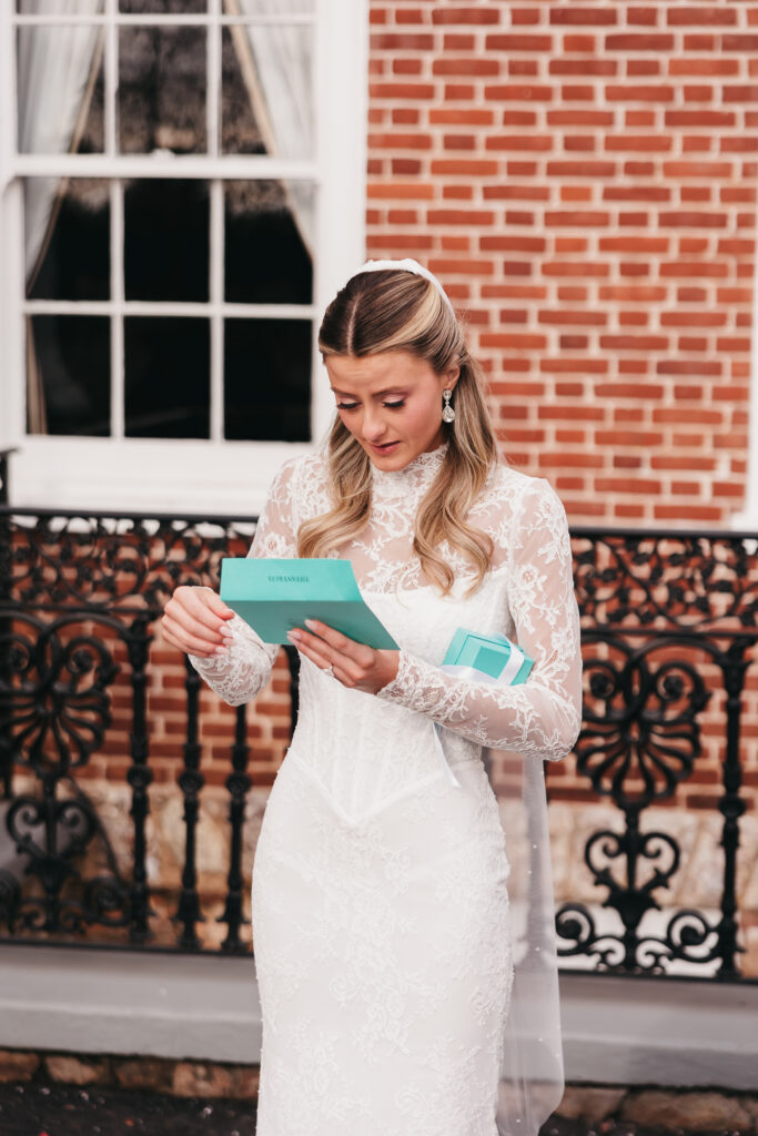 The air carried a gentle December chill as the morning unfolded, crisp, still, and full of anticipation. Inside the bridal suite, warm light filtered through tall windows, catching on lace fabric, gold and silver details, and the soft movement of hands helping Olivia into her gown. There was an unspoken reverence and so much joy in the room — the kind that settles when something meaningful is about to begin. It was such a fun space to photograph the details and candid moments.