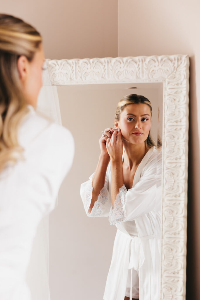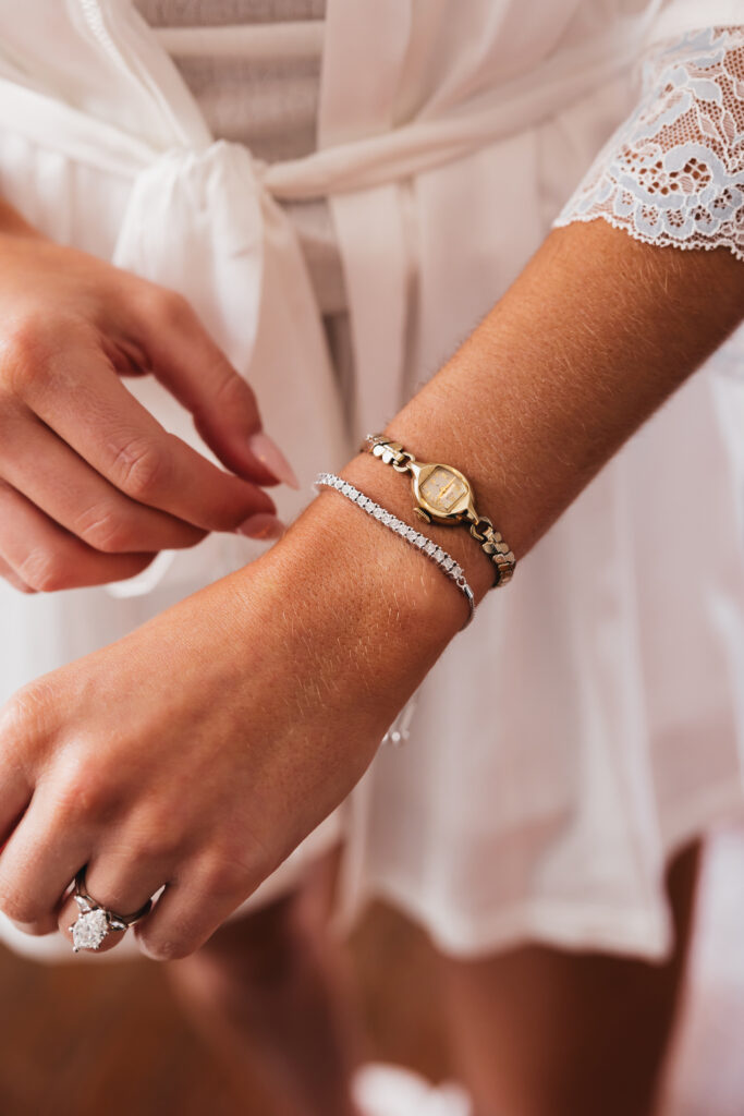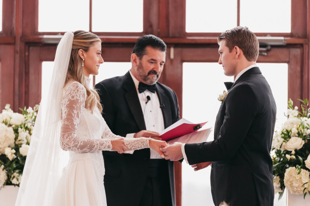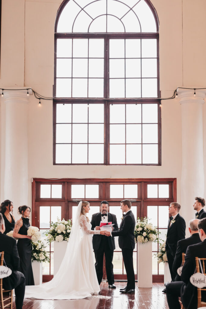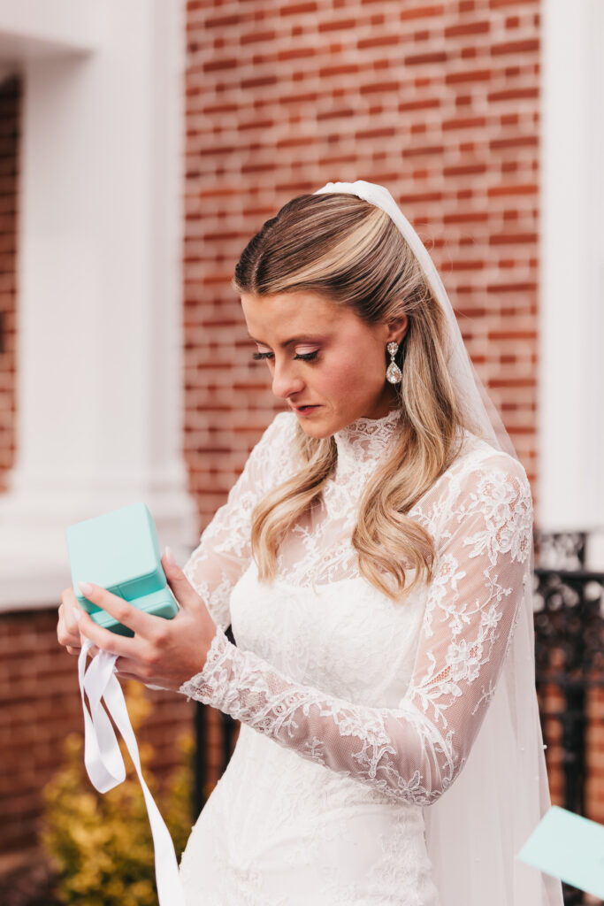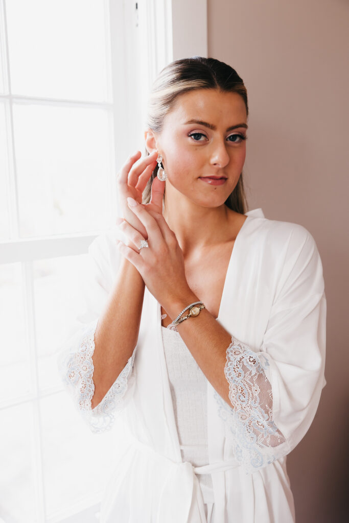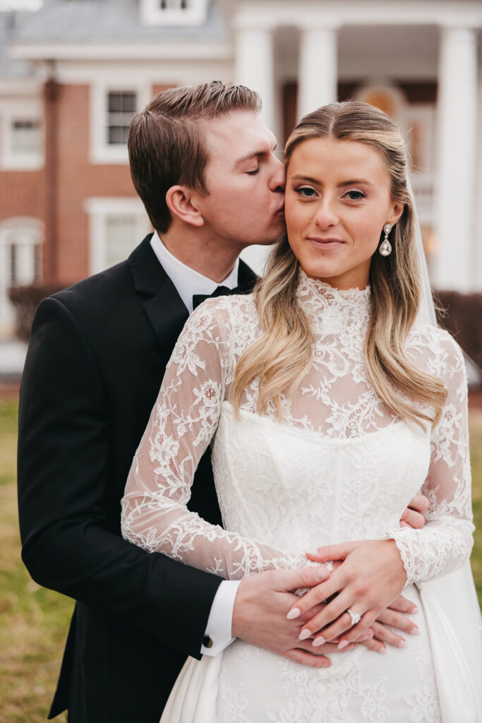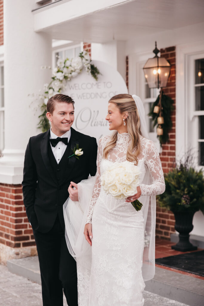 The air carried a gentle December chill as the morning unfolded, crisp, still, and full of anticipation. Inside the bridal suite, warm light filtered through tall windows, catching on lace fabric, gold and silver details, and the soft movement of hands helping Olivia into her gown. There was an unspoken reverence and so much joy in the room — the kind that settles when something meaningful is about to begin. It was such a fun space to photograph the details and candid moments.