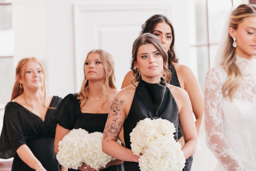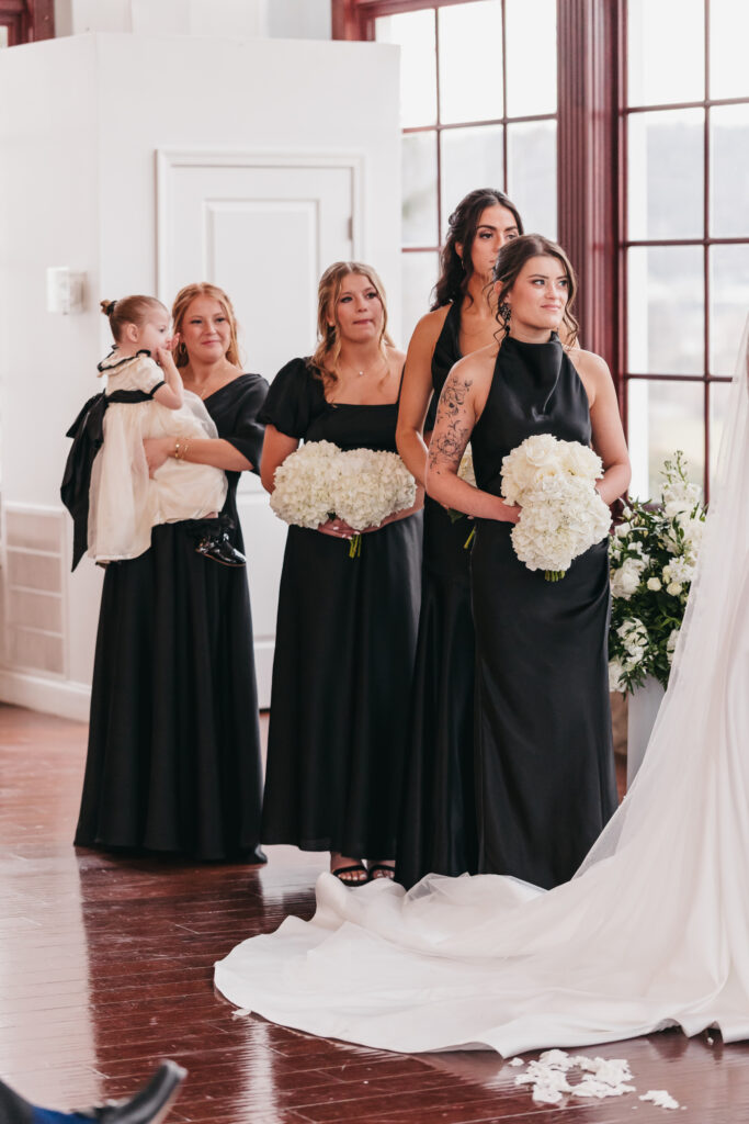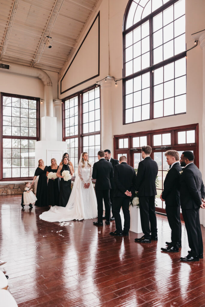 Wrapped in a timeless palette of black, white, and soft metallics, their wedding party brought both elegance and joyful energy to the day. Fourteen bridesmaids and eight groomsmen filled the manor grounds with movement and laughter. Portraits felt effortless, refined, but full of life. They braved the cold like true champions and it was so worth it.