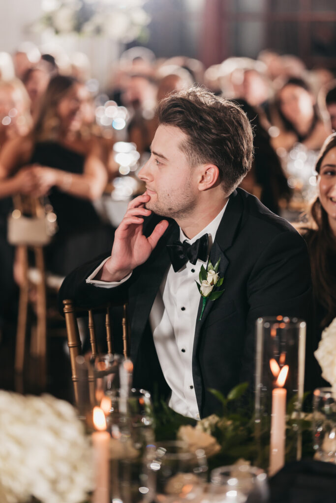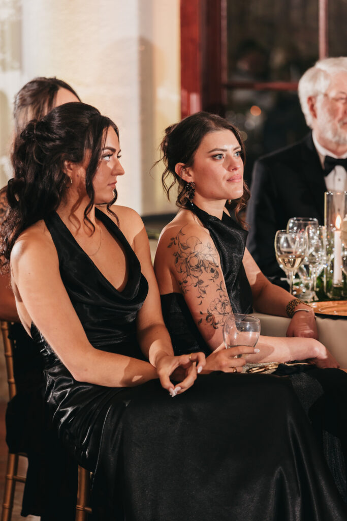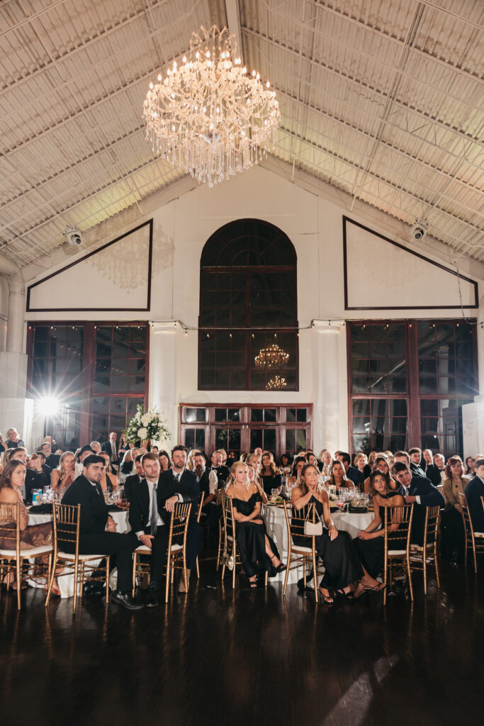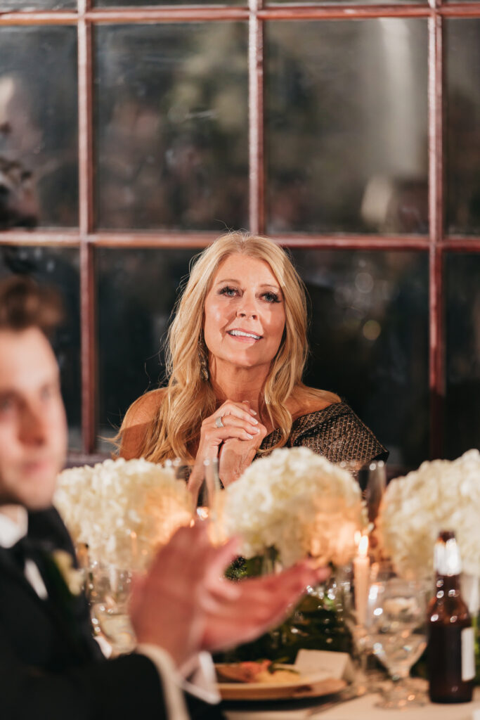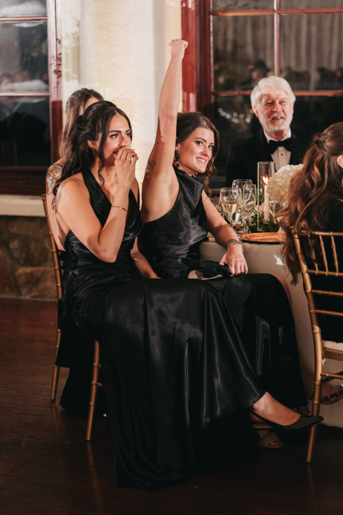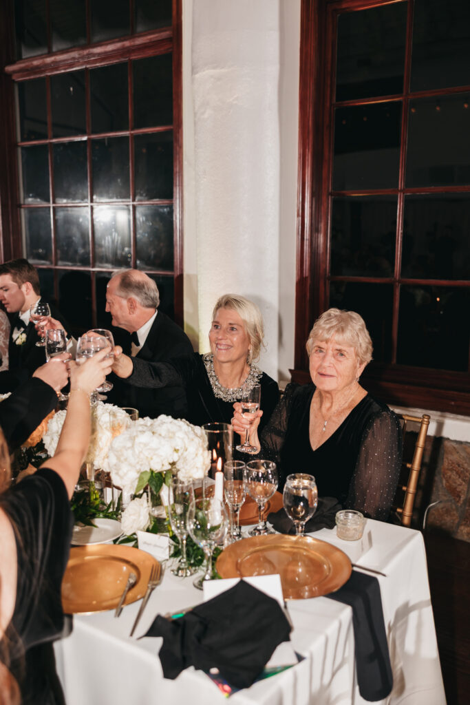 Inside, Raspberry Plain Manor glowed with candlelight. Soft flickers danced across stone walls and tabletops as guests gathered after a lively cocktail hour, coats draped over chairs, glasses catching the light, voices rising in low, joyful hums. The sound of celebration built slowly and layered with warmth, movement, and anticipation.