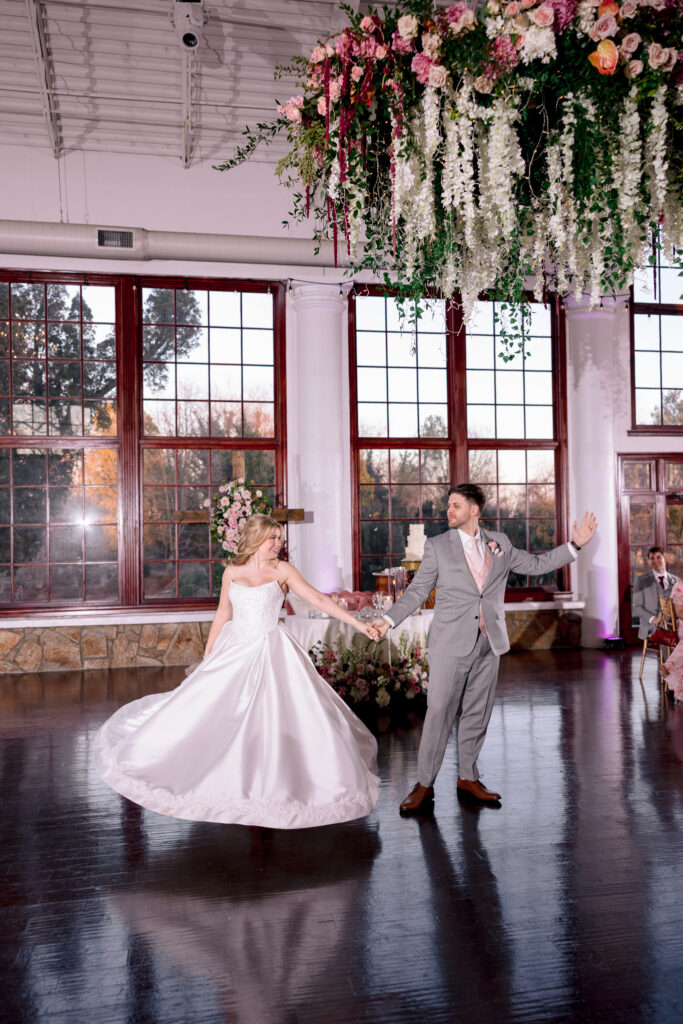 Florals by Petal & Bloom Studio layered blush, ivory, and soft greens into arrangements and ceiling installations that felt organic and painterly. Everything was intentional.